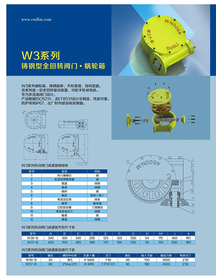 W3系列蝸輪箱,殼體采用WCB鑄造,蝸桿兩端使用圓錐滾子軸承支撐,該系列是一款多回轉(zhuǎn)驅(qū)動裝置,可選配手輪或電裝。適用于閘門,三通球閥等。